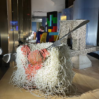 [walking we saw these fun art chairs. The space one is crochet and the spaghetti one... speaks for itself. The macarons were at this place I like called Bibble and Sip. It was quite disappointing this weekend though. This was one of the places that closed right as we approached after paella. And we tried again bc I really like their cream puffs but they had NO MORE cream puffs >:(. Just gonna have to keep trying. They did have these cute Lunar New Year macarons though :0 didn't get any but they were cute.]
